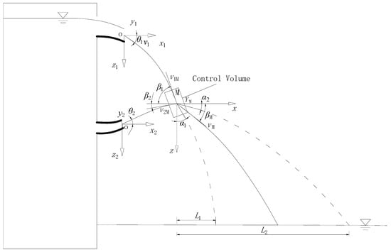 As shown in Figure 9, based on previous research on collision flow [], the surface water tongue and deep water tongue completely collide in air; then, two water tongues combine and shoot in one direction. V1 is the surface hole water tongue velocity, θ1 is the angle of depression, and q1 is the discharge per unit width; in addition, V1 is the deep hole water tongue velocity, θ2 is the pick angle, and q2 is the discharge per unit width. Two water jets meet at the unit of M. At the confluence, the flow velocity of the upper edge of the water tongue at the confluence is V1M; the angle between the upper edge of the water tongue and the horizontal direction is β1; the flow velocity of the inner edge of the water tongue is V2M; the angle between the inner edge of the water tongue and the horizontal direction is β2; the flow velocity of the mixed water tongue after the phase confluence is VM, and the angle between the water tongue and the horizontal direction is βM.