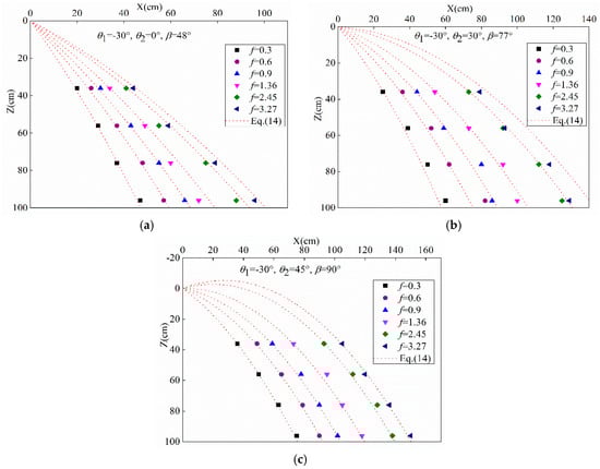 Comparison of experimental and calculated values of the maximum rainfall intensity points. (a) θ1 = −30°, θ2 = 0°, and β = 48°; (b) θ1 = −30°, θ2 = 30°, and β = 77°; (c) θ1 = −30°, θ2 = 45°, and β = 90°.