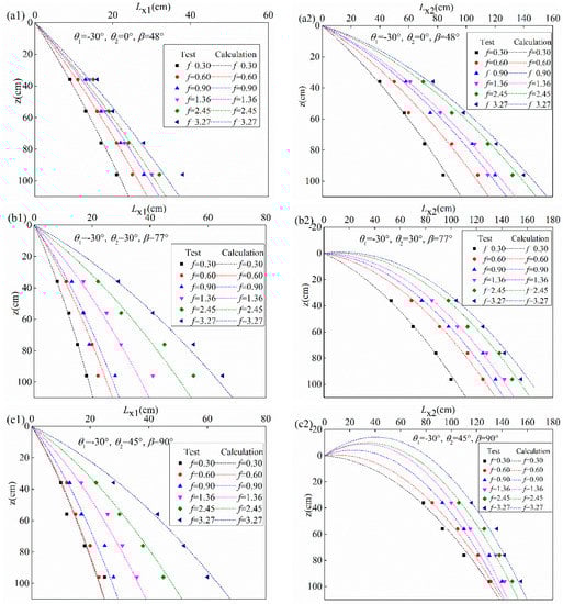 Comparison of the experimental and calculated values of LX1 and LX2. LX1 is the distance of inner edge water tongue in x axis, LX2 is the distance of outer edge water tongue in x axis. (a1) θ1 = −30°, θ2 = 0°, and β = 48°; (a2) θ1 = −30°, θ2 = 0°, and β = 48°; (b1) θ1 = −30°, θ2 = 30°, and β = 77°; (b2) θ1 = −30° and θ2 = 30°; (c1) θ1 = −30°, θ2 = 45°, and β = 90°; (c2) θ1 = −30°, θ2 = 45°, and β = 90°.