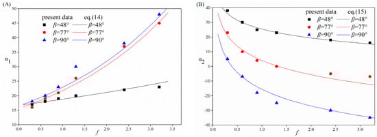 The calculated values of α1 and α2 are shown in Figure 12. Note that (1) with the identical collision angle β, α1 increased, and with the increase in flow ratio, α2 decreased; and (2) with the identical flow ratio, α1 increased with the increase in collision angle β, and α2 decreased with the increase in collision angle β. It can also be seen from Figure 12 that α1 approximately shows exponential growth with the flow ratio, and α2 shows logarithmic growth with the flow ratio. Data analysis indicates that the values of α1 and α2 are obtained as