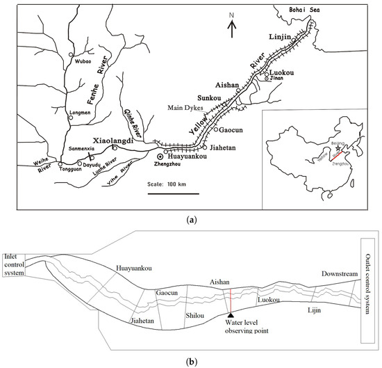 The study area is located in the lower reach of the Yellow River, in central China, stretching from the Xiaolangdi Reservoir to the Yellow River estuary, and comprising a distance of approximately 800 km (Figure 1a). The bed slope varies from 0.010% to 0.012%. The drainage area of the LYR is 23,000 km. The width between the levees varies from 1 to 4 km; however, the width of the main channel is only about 500 m. Most of the cross-sections are compound sections. The wide flood plains between dykes are extensively cultivated. Here, more than 2000 natural villages had formed by 1900 and nearly 1.8 million people live on these flood plains. The total area of the flood plains is 3956 km, accounting for 85% of the total area between the levees.