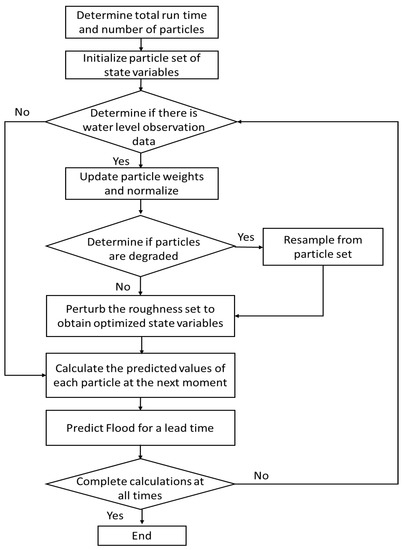 - At the initial time, a random sample from the initial distribution of the water level, flow discharge, and roughness of each cross-section along the river as well as a set of particles with equal weights are obtained.