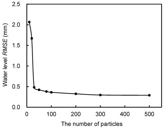 In the assimilation model, a larger number of particles indicates better correction performance. However, with increasing number of particles, the computation load also increases greatly. Sensitivity analysis on particle number was conducted by choosing one of the experiments. Figure 3 shows the relationship between the number of particles and the water level root mean square errors. The water level s decreased with increasing number of particles. Especially, the s decreased sharply when the number of particles was below 50. To ensure the simulation accuracy of the model and short calculation time, the number of particles was set to 100.