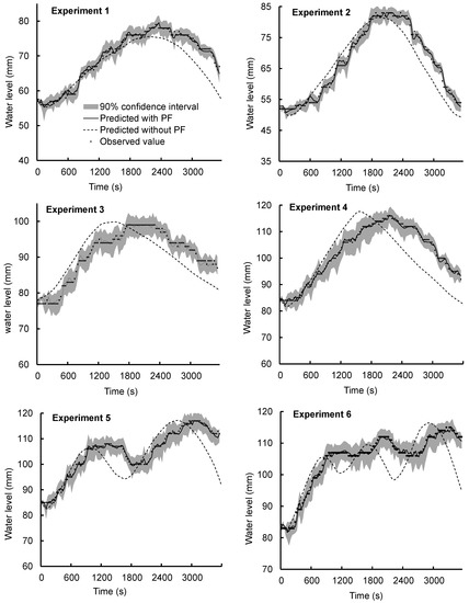 The observed water levels of the last six verification experiments were chosen to verify the correction performance of the assimilation model. The total run time of each experiment was 1 h and the assimilation correction time step was consistent with the water level acquisition time step (both 10 s). Figure 4 shows a comparison between observed and predicted water level processes both with PF and without PF (only traditional hydrodynamic model) for the experiments. Figure 4 shows that the predicted water level without PF deviates greatly from the observed curve with increasing time, while the level predicted with PF is closer to the observed value. This is because the assimilation model incorporates the observed value in real-time, and parameters of the model are constantly optimized to let the result approach the actual value. In addition, many values fall within the 90% confidence intervals.