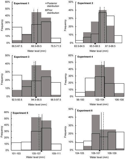 Histograms of prior (gray) and posterior (colorless) distributions of water levels in different experiments. The observed value is marked with a black triangle. The black dotted line indicates the mean value of the prior distribution of particles and the black solid line indicates the mean value of the posterior distribution of particles.