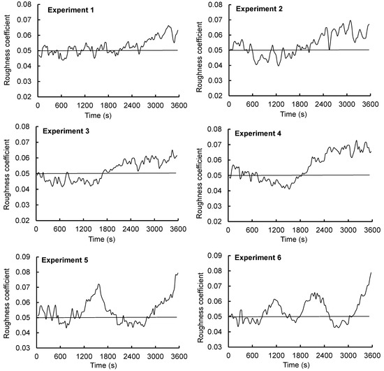 Figure 6 shows the roughness retrieved from the observed data over time. The curves indicate the real-time correction processes of roughness, and the straight line indicates the fixed value used in the hydrodynamic mathematical model. Figure 6 shows that the changing process of the corrected roughness is rather complicated. Different experiments show that the roughness continuously fluctuated but changed gently in the increasing phase of the flow process. However, during the decreasing phase of the flow process, the roughness changed sharply and increased continuously. This phenomenon is more apparent in Experiments 4–6. This characteristic is consistent with previous studies on the analysis of the change in the resistance characteristics of the channel in the LYR [26]. Within a certain flow range, the roughness coefficient is inversely proportional to the flow rate. This is mainly due to the form resistance of both the side walls and the riverbed.