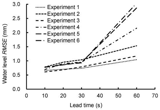 Figure 7 shows the relationship between the lead times and the s of water level predictions for different experiments. The following results were obtained: (1) Under different inflow conditions, the s of the predicted water level increases significantly with increasing lead time. (2) Comparison between the experiments of both verification groups showed that there is little difference of the RMSEs when the lead time remained below 30 s; however, the s of the second group was clearly larger than that of the first group for a lead time above 30 s. The main reason is that the roughness value used to predict the flooding process in the future is the current roughness value, which changed constantly during the actual flood process. The water flow fluctuations are more complicated in the second group and the magnitude of the change of the incoming water flow exceeds that of the first group. The uncertainty of the roughness coefficient obviously increased with increasing lead time.