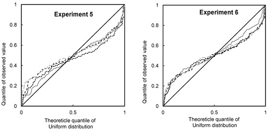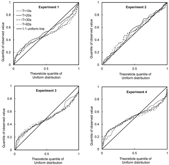 The quantile-quantile plot (Q-Q plot) was also used as a visual method with which to examine the reliability of the probability distribution. In the Q-Q plot, the x-axis is a theoretic quantile of a uniform distribution and the y-axis is the actual quantile of the observation. If the plot follows a 1:1 line, the probabilistic prediction is perfectly reliable. A detailed description of the Q-Q plot can be found in Laio and Tamea [25]. The Q-Q plot has a corresponding quantitative indicator-reliability :