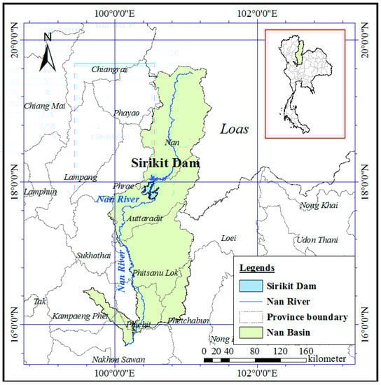 The Sirikit Dam is located in the Nan River Basin, one of the eight sub-basins of the Chao Phraya River Basin in Thailand, as shown in Figure 1. It is the largest earth-filled dam in Thailand, with a catchment area of 13,130 km2 and a maximum storage of 10.64 km3. The main functions of this dam are flood prevention, water supply for domestic use, ecological conservation, agriculture, industry, fishing, and as an important tourist attraction.