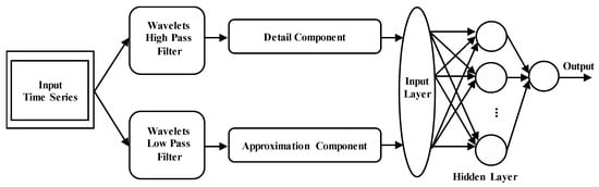 The WANN is a hybrid version of the ANN model in which wavelet analysis is used as a data pre-processing technique to improve accuracy. According to the investigation of the American Society of Civil Engineers (ASCE) Task Committee on Application of Artificial Neural Networks in Hydrology [] that a feed-forward network with a single hidden with an arbitrary number of sigmoidal hidden nodes can approximate any continuous function, a multilayer perceptron (MLP) feedforward network with one hidden layer was adopted in this study. The network was trained in a supervised manner with an error back-propagation algorithm. As suggested in Panagoulia et al. [], input variables should be “first stage” selected, depending on their robustness, from an inclusive set which influences the physical model underlying the ANN structure with the constraint of minimizing redundancy and noise. In the second stage of selection, an association via statistics must be established to determine those first stage input variables that are maximally and distinctly connected to the major internal model variables. In this study, the reservoir inflow was selected and the autocorrelation analysis between different lag versions of those inflows was performed in an initial experiment. After that, other inputs were selected and cross-correlation analyses between the different lag versions of those inputs and the inflows were performed. Trials with changes in activation function, learning rate, number of hidden neurons, and momentum of the ANN network were also performed to obtain the best forecasting results. After obtaining the best forecasting results for each input dataset, the original input data were then decomposed into their detailed (high frequency) and approximated (low frequency) components by a discrete wavelet transform. Based on the study of Wang et al. [], using different mother wavelets in the wavelet neural network affected the accuracy of prediction results. In this study, the Haar wavelet, the simplest and oldest of all wavelet functions [], was used. This wavelet function provided a good prediction result in the study of Wang et al. []. The simplicity of this wavelet function facilitated the decomposition process and consequently supported practical implementation. Only one level of decomposition was used in this study. After decomposition, the decomposed data were used as the input for the ANN model. The architecture of the WANN model used in this study is shown in Figure 2.