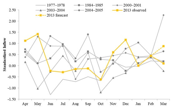 For the forecasting using the WMAM and VAM methods, reservoir inflow data from 1974 to 2004 were used to forecast the inflow of the years 2005 to 2014. Therefore, there were at least 31 years of monthly records for use as historical analogues. For the WMAM method, the selection of potential historical analogues was based on calculation of the RMSE as described in the Methodology section. Figure 3 shows an example of reservoir inflow forecasting for March 2013. Five historical analogues gave the minimum root mean square values selected for the forecast. After selection, the weights for each analogue were calculated, and these weights were then used to calculate the forecast standardized value and converted to obtain the forecast inflow for March 2013. The yellow broken line and the yellow solid line are the forecast and observed standardized inflows in March 2013, respectively. The forecast standardized inflows were converted to inflows in a normal form and used to calculate the performance indicators.