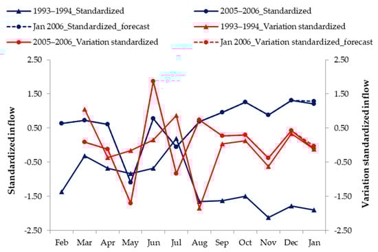 Variation and standardized values of inflows used for forecasting inflow in January 2006.