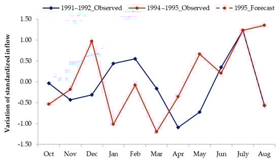 To improve forecasting results of the VAM, additional processes to assist selection of the most similar analogue were investigated. Consider the predicted inflow of the Sirikit Dam in August 1995, which was the most extreme Sirikit Dam inflow on record, shown in Figure 5. The plot of the variation in standardized inflow for June–July 1995 is very similar to the plot for the same period in 1992. The forecast variation in standardized inflow in August 1995 should follow the red dotted line. Nevertheless, the actual variation followed the dark red line, which is very far from the forecast result. These observations indicate that the VAM still has some weaknesses and requires further improvement.