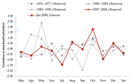 - The variations in standardized inflows for March to December 2007 are plotted along with the variations in standardized inflows for March to January of the available analogues. Potential analogues with variation patterns similar to that of December 2007 are selected. In this case, there are three historical analogue candidates: December 1976, December 1988, and December 1989 (Figure 6).