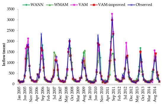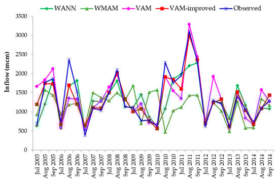 Based on the results described above, the improved VAM that considers climatic indices was used to forecast July, August, and September, which are high-flow periods in Sirikit Dam inflow. The forecasting performance of all methods for the whole-year and high-flow periods was evaluated and compared. To compare the performance of the WANN with other methods, the forecasting results of the WANN in the validation and testing periods were combined and the performance indicators were recalculated to match the forecasting period of the WANN with that of the WMAM and VAM. The performance indicators of all methods in predicting the reservoir inflow of the Sirikit Dam from January 2005 to December 2014 are shown in Table 4. Plots of forecast and observed inflows for the whole-year and high-flow periods are shown for comparison in Figure 7 and Figure 8, respectively.