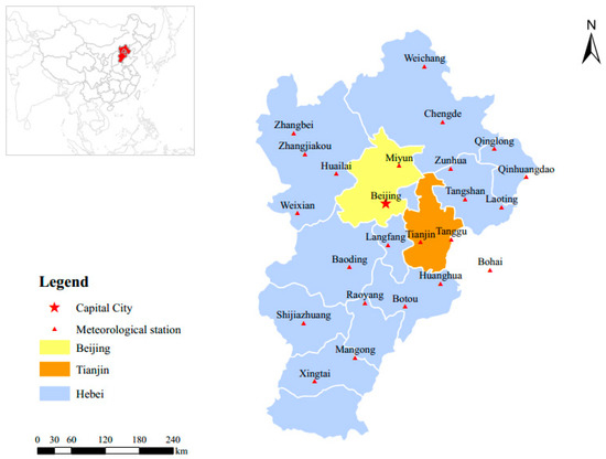 Beijing–Tianjin–Hebei metropolitan areas (BTHMA), located in northeast part of China, are consist of Beijing, Tianjin and Heber Province. BTHMA is the most important political, economic and cultural centre of China. Since it locates in northeast part of China, it is regarded was a water-stressed area. So, drought and water scarcity have become important factors for sustainable development of BTHMA.The study area comprises roughly 222,000 km2, accounting for only 2% of the total area of China. Yet the population in this area reaches 111.5 million, accounting for more than 8% of the total population in China. Southeast of BTHMA is mainly flat, while its northern areas consist of plateaus and mountains. The geographic features affecting the climate of BTHMA are the Inner Mongolia Plateau, the Hubei Plains, and the Bohai Sea []. The climate type of this area is temperate semi-humid semi-arid continental monsoon climate. Affected by the East Asian monsoon circulation and the mid-high and low latitude weather system activities, the annual precipitation is very uneven distributed in space and time. On average the maximum precipitation occurs in July and August and the minimum in February.