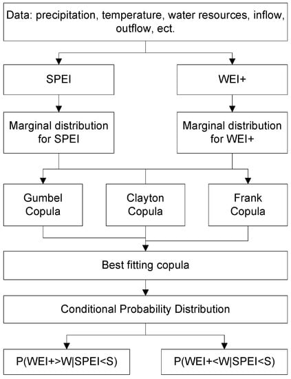 Copulas can provide both joint probability distribution and conditional probability distribution. Joint probability is the percentage of two or more things happened at the same time. When using copulas for hydrological analysis, joint probability distribution is commonly used between different characteristics of one hydrological event. For example, when analyzing flood characteristics, the joint distribution of flood peak and flood volume is established for joint probability estimation [,]. When analyzing drought characteristics, the joint distribution of duration and severity is established for joint probability estimation [,]. Conditional probability is the percentage of something happen under a certain condition. The aim of this study is to quantify the relationship between meteorological drought and water scarcity. Meteorological drought and water scarcity are two different phenomena. They may happen at the same time, but usually meteorological drought happens before water scarcity, and commonly meteorological drought is the cause of water scarcity. So, we choose the conditional probability distribution for analysing, but not joint probability distribution, for the reason that the conditional probability distribution can in some level quantify the relationship between meteorological drought and water scarcity, while the joint probability distribution cannot. According to the definition of meteorological drought and water scarcity, meteorological drought is the precondition of water scarcity, so SPEI is set as a certain condition.