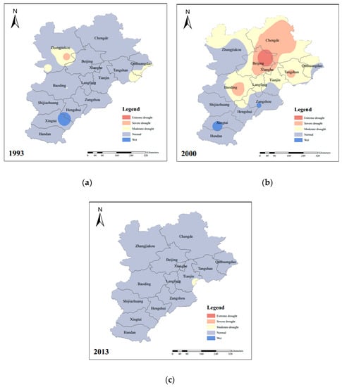 (a) Spatial distribution of SPEI in 1993; (b) Spatial distribution of SPEI in 2000; (c) Spatial distribution of SPEI in 2013.