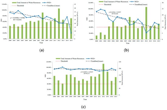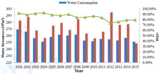 We used Equations (10) and (11) to calculate the renewable water resources given the intensive human activities from the large population in BTHMA. Based on the available data collected from Water Resources Bulletin, we use Equation (11) to calculate WEI+. The calculated WEI+ value of the entire study area from 2001 to 2015 is listed in Table 4 and Figure 4.