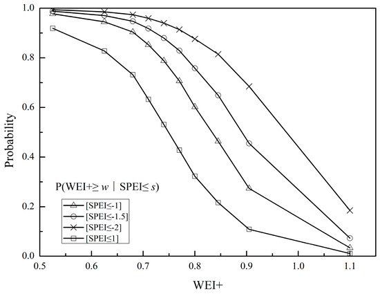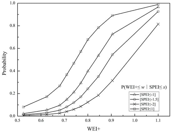 If SPEI is less than a certain threshold (SPEI ≤ S), the probability that the WEI+ is less than a certain threshold (WEI+ ≤ W) is given as follows [].