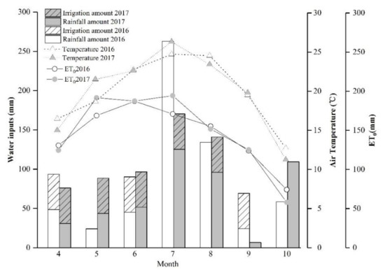 The precipitation, irrigation, air temperature, and reference evapotranspiration (ET0) of the apple orchard during the growth seasons of 2016 and 2017.