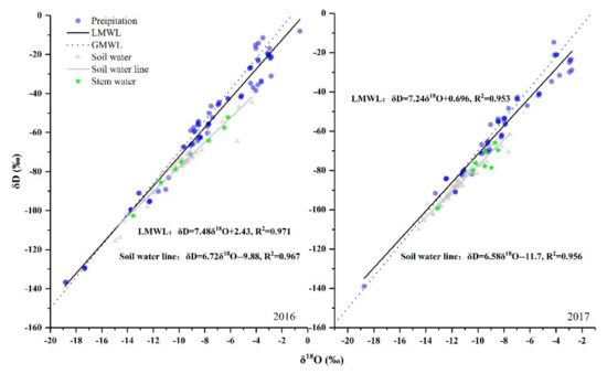 During the apple’s growth seasons during 2016 and 2017, the stable isotopic values of precipitation water varied sharply (ranging from −0.6‰ to −18.9‰ for δ18O and from −8.1‰ to −136.7‰ for δD in 2016, and from −2.7‰ to −18.7‰ for δ18O, and from −14.7‰ to −138.9‰ for δD in 2017). The local meteoric water line (LMWL) fitted by the δ18O and δD of precipitation water was δD = 7.48 × δ18 + 2.43 (R2 = 0.971) in 2016, which lay below the global meteoric water line (GMWL, δD = 8 × δ18O + 10). The slope of LMWL would coincide with that of GMWL without the effect of evaporation, but in this study, the lower slope showed that atmospheric rainfall was greatly affected by evaporation during the landing process. Compared with 2016, the slope of LMWL (Figure 2) in 2017 was slightly lower because of higher air temperatures and lower humidity (Figure 1). The LMWL established by Wang et al. [15] (δD = 7.45 × δ18O + 1.74) and by Guo et al. (δD = 7.78 × δ18O + 2.38) [42], in the southern Shanxi Province and in the Beijing area (δD = 7.50 × δ18O + 4.20) [27] are similar to results from this study.