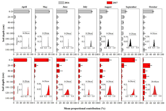 The proportions of soil water contributions at different months in the 2016 and 2017 seasons. The frequency histograms show the estimated ranges of proportional contributions of water from the main soil depth to the total apple water uptake, the x-axis was the proportional contribution from 0 to 1, and the y-axis was the frequency. The error bars are the standard deviation.