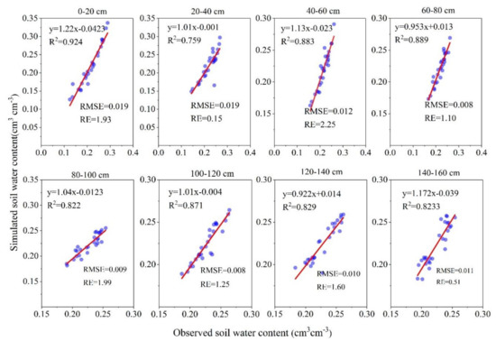 The linear relationship between the experimental and simulated values of soil water content at different soil depths. The root mean square error (RMSE), relative error (RE), and coefficient of determination (R2) are shown.