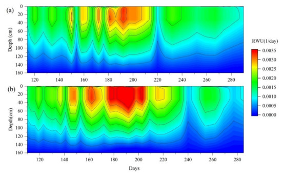 Figure 5 illustrates that the RWU of apples decreased sharply with depth and that most uptake occurred in the upper soil layer. The main range and intensity of RWU of apple initially increased then subsequently decreased over time and reached the maximum during July. The RWU rate was higher in the 0–60 cm soil layer and accounted for an average of 60% of the total RWU rate during both seasons. Using a numerical model, Green and Clothier [48] also found that when surface soil layers were uniformly wet, 70% of mature apple trees’ RWU occurred in the top 40 cm of the root zone. Besharat et al. [49] showed that the maximum RWU was at a depth of 10–50 cm using the 2-dimensional model of apple trees.