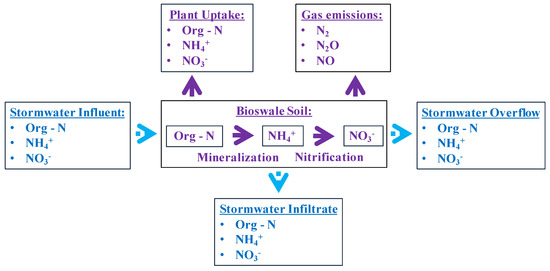 Nitrogen (N) is considered the most problematic pollutant for U.S. coastal waters, having degraded the marine ecosystems, fish production, and recreation of two-thirds of the U.S. coastline [1]. Due to fossil fuel combustion from power plants and vehicles, 47% more nitrogen accumulates on impervious surfaces in urban compared to nonurban areas [2]. Bioswales, which are a common feature of many cities’ green infrastructure (GI) plans, are vegetated structures designed to reduce water pollution by absorbing stormwater runoff from impervious surfaces [3]. However, recent studies have demonstrated that these GI types can contribute to nitrogen pollution [4,5,6,7]. During wet weather conditions, high concentrations of nitrogen enter bioswales via stormwater influent, and potentially exit via surface overflow and/or subsurface infiltration [8,9,10,11]. In dry weather conditions, the nitrogen source comes from soil mineralization, a commonly used index of soil nitrogen availability [12,13,14], which describes the rate that soil microbes decompose long-term stores of organic nitrogen (org–N) into ammonium (NH4+) (Figure 1). Mineralization processes occur in all soils. In well-drained soil environments, nitrifying microbes then further transform this ammonium to nitrate (NO3−), the most common drinking water pollutant [15] and a highly mobile anion that readily leaches out of soils [10,16]. Bioswales are most frequently made with fast-draining soils that are primarily aerobic, creating a dry environment hospitable to nitrifying microbes, and thus have high levels of nitrification [5,10,17,18]. Brown et al. [19], Lucas and Greenway [20], and McPhillips et al. [21] suggest that excess mineralization and nitrification account for why bioswales have been found to leach nitrate, which can be quickly flushed out following rain events [4,6,10]. Surprisingly, neither mineralization nor nitrification rates have been well quantified in bioswales.