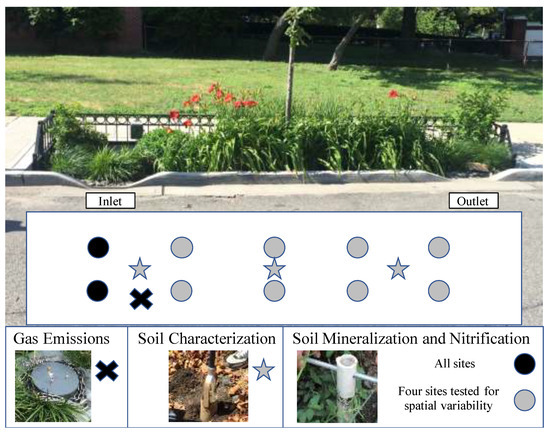 Better quantification of nitrogen cycling in bioswales is the first step toward improving the design and management of these GI installations in order to minimize their nitrogen export [5,31]. In particular, research that examines the distinctions between mineralization, gas emissions, and plant uptake is greatly needed [5,12,32,33]. This study aimed to meet this need by measuring the levels of nitrogen in soil, gas, and plant forms within seven bioswales located in New York City (NYC) over a period spanning from June 2015 to October 2016. The specific objectives of the study were to: (1) quantify spatiotemporal variability of soil mineralization and nitrification across the study sites, (2) measure nitrogen gas emission rates, (3) estimate maximum nitrogen uptake rates by the vegetation, and (4) use the results to construct an overall nitrogen mass balance for a bioswale. The results suggest that bioswale soils should contain greater C:N ratios from the outset and be maintained without additional fertilizers.
