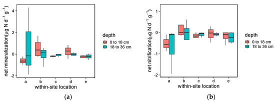 Within-site spatial variability from bioswale inlet to outlet for (a) net mineralization and (b) net nitrification. Nitrogen transformation rates (μg N d−1 g−1 dry soil) as calculated with Equation (1) quantify differences between initial and one-week incubations for shallow and deep halves of soil cores at four bioswales (ROWB 26B, ROWB 9B, SGS 11, SGS 21) (n = 36). “a” denotes the soil cores closest to the inlet, and “e” denotes the soil cores closest to the outlet. ROWB: right-of-way bioswale; SGS: stormwater greenstreet.