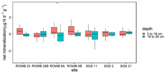 Net mineralization rates (μg nitrogen (N) d−1 g−1 dry soil) as calculated in Equation (1) quantifying differences between initial and one-week incubations for all soil cores at seven bioswales sampled at two depths (n = 209). * signifies bioswales where shallow (0 to 18 cm) and deep (18 to 36 cm) samples were statistically different. ROWB: right-of-way bioswale; SGS: stormwater greenstreet.