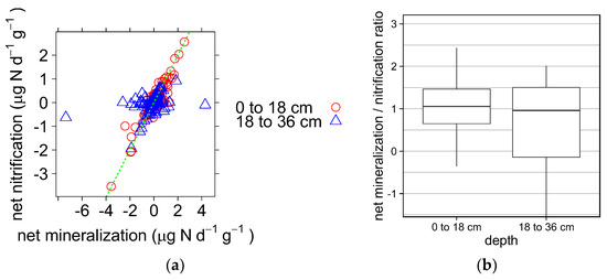 Relationship between net nitrogen mineralization and net nitrification (μg nitrogen (N) d−1 g−1 dry soil) for shallow and deep halves of soil cores at seven bioswales (n = 209) (a) Dotted line denotes 1:1 ratio; (b) Net mineralization/nitrification ratio.