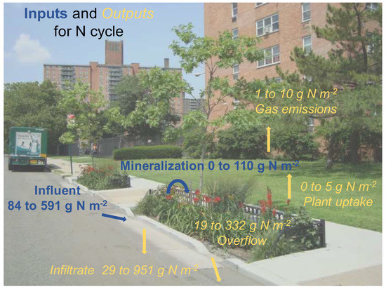 Thus, bioswale nitrogen cycling is dominated by liquid and soil phase fluxes, with relatively much smaller fluxes in the gas and plant phases. In contrast to natural ecosystems, where external inputs of nitrogen are about 10% of the amount of nitrogen that annually cycles [54], stormwater inputs of nitrogen in the studied urban bioswales constitute most of the nitrogen that annually cycles. We found that gas emissions were a small portion of the overall mass balance, which was similar to findings by Payne et al. [69] and Morse et al. [70], who found that N2O emissions were only 1 to 2% of the incoming nitrogen amount.