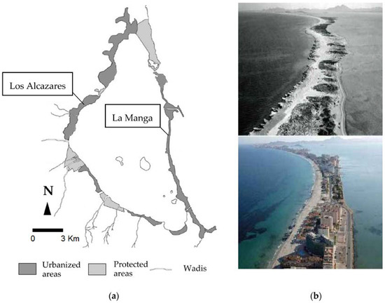 (a) Current situation of the Mar Menor: Urbanized areas, protected salt marshes and wadis. (b) La Manga ancient dune cord in 1950 (up) and now (down, source: Paisajes Españoles S.A.).