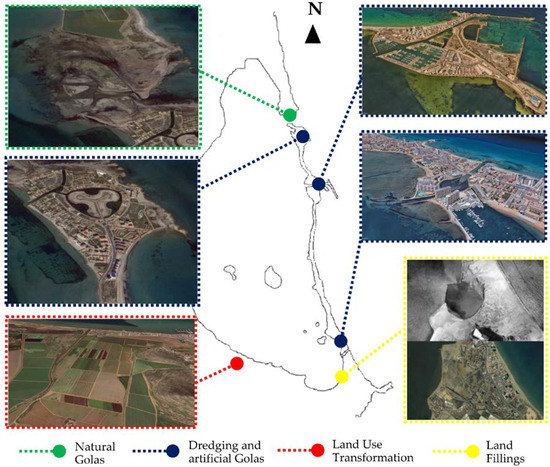 There are other factors with major impacts that may generate an artificial alteration of the coastal configuration by direct anthropization not linked to building constructions or marine infrastructures. This is the case, for example, of channel dredging, agricultural land use modifications, coastal landfills, or simply alterations of the coastal space that cannot be attributed to a single cause or whose origin is unknown. In the case analyzed, we have a varied catalog of anthropic activities in this field (Figure 5), to which the territorial complexity of the existence of the ancient dune cord that separates the Mar Menor from the Mediterranean Sea must also be added. These two water masses are connected through 5 channels called “golas”, whose configuration is quite heterogeneous. On the one hand we find three such channels in the Northern area, which, being located in an environmentally protected area, remain theoretically unaltered. On the other hand, the other two channels are further South and there is also an interior dredged area in the shape of a clover in the North, whose natural configurations were altered, with its bottom having been widened and dredged to facilitate maritime navigation of large boats. This last phenomenon has given rise to controversies about a possible “mediterraneanisation” process of the Mar Menor, which will be discussed later.