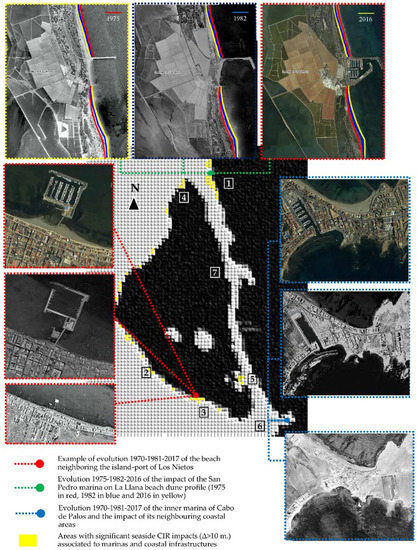 In the case of ports located on land reclaimed from the sea and harboring the port dock through breakwaters, we can find usual coastal behavior in these infrastructures in the Mediterranean. The beaches located to the North of the port increase their surface area while those located to the South experience important retraction phenomena over the years. In this section, the case of the San Pedro del Pinatar marina (numbered as 1 in Figure 7), located on the Mediterranean side, is especially interesting, and it has made almost 80% of the well-known La Llana Beach disappear within a period of 20 years (see the evolution in the upper part of Figure 7).
