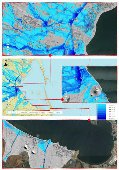 Another important issue concerns the limitations of the methodology used. In the analyzed case, a very accurate geo-referenced cartography was available for different dates, as well as a DTM model that enables the orographic natural and urban reality to be represented in a reliable way. Additionally, the existence of an orographically simple terrain and an urban configuration without great constructive singularities have both considerably facilitated the work. It was only necessary to calibrate the mathematical models to represent the “dam effect” of the AP-7 highway, and the marine flooding in the golas as a result of the dredging presents some minor uncertainties. However, the model at the global level can be considered very robust, with the data used as input to the geo-statistical analysis being considered very reliable. Even so, this statement clearly cannot be extended to every study, and it is thus necessary to maximize the precision in the DTM model and take caution in mathematical models when we are faced with complex natural orography or urban configurations with several constructive singularities.