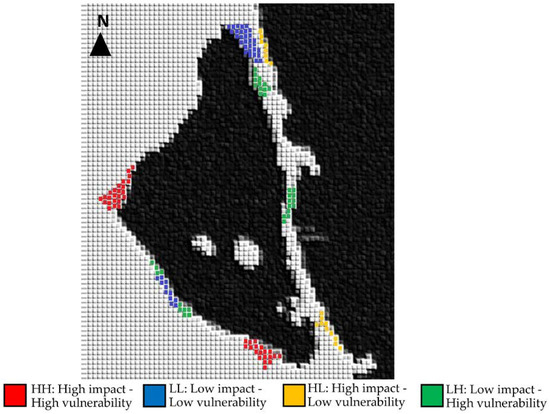 In this sense, to correctly implement these strategies to mitigate the existing vulnerability, it is very important to know which elements have a negative impact and which have a positive or negative impact, both in the current scenario and in their trend trajectory. In addition, it must be taken into account that complex environments such as the one analyzed can have cross-linked impacts, generating a negative effect in one place, while generating a positive effect in another. This mapping context with different scenarios of the couple human impact-vulnerability (HH, LL, HL, and LH) would allow us to implement a segmented mitigation strategy with different sub-strategies depending on how different impacts of human activity affect the current coastal vulnerability at a spatial level.