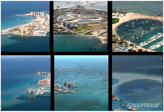 Simulation carried out in 2007 of the estimated sea level rise in different sites of La Manga for the year 2050 as a result of climate change. Source: Greenpeace.