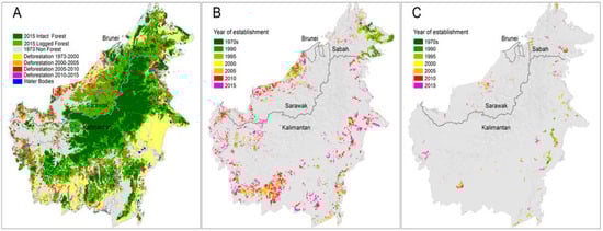 (A) Total deforestation (18.7 Mha) and remaining old-growth and selectively-logged forest in December 2015; (B) The expansion of industrial oil-palm plantations (7.8 Mha); (C) The expansion of industrial pulpwood plantations (1.3 Mha) in Borneo [8].