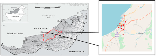 Location of study area: Bintulu Division, Sarawak, West Malaysia Borneo (shown in red dots).
