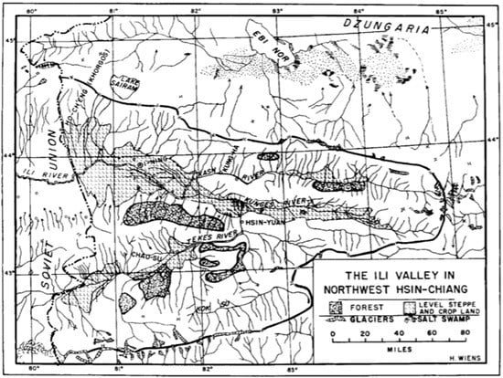 Early 20th century travelers described a landscape of hamlets along the Chinese reaches of the Ili River, with adjoining fields, rice paddies and tracts of trees and grazing lands [46]. The revolution of 1911–1912 ended the Qing dynasty and ushered in a new republic, once again disrupting agriculture and leaving many of the Ili River Valley’s fields untended [42,66]. The Sibos and Solons nevertheless survived the unrest and were able to prosper as farmers in the valley [36]. Irrigation and land reclamation were prioritized during the early years of the republic, but political instability caused irrigation in Xinjiang (separate figures are not available for the Ili River valley) to fluctuate greatly: from 802,000 ha in 1918 to 309,000 ha in 1933, 996,000 ha in 1942 and 373,000 ha at the inauguration of the People’s Republic in 1949 [58]. Irrigation research facilities were nevertheless established and dozens of new water conduits were opened and repaired such that by 1944 Xinjiang possessed 944 main irrigation canals and 2.335 branch canals, many in the Ili River valley [67].