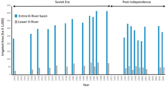 Changes in irrigated area within the lower Ili River basin prior to and after Kazakhstan’s independence from the Soviet Union. The data, which span 1963 to 2006, are not available for all years and are from previously cited statistical sources [2,62]. The lower Ili River constitutes the area below the dam site.