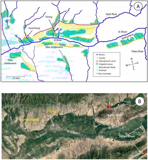 Irrigated areas of the upper Ili River Valley as of (A) the early 20th century and (B) the early 21st century. (A). Simplified and redrawn map based on an early drawing and an older map of the region [42] showing land use categories, Sibo settlements and the oasis at Tokkuztara. Feeder streams, which flow towards the Ili from northerly and southerly directions, are identified. (B). Landsat satellite image of the same area in 2018. Two modern reservoirs are visible and marked with red dots. The Ili, Kash and Tekes rivers, as well as the towns of Huocheng and Yining, are labeled in both (A) and (B).