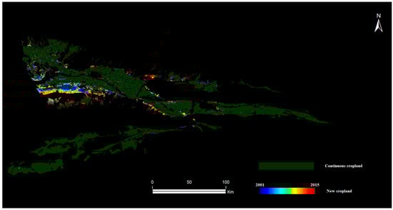 Time series progression of newly reclaimed cropland in the upper Ili River valley of China between the years 2001 and 2015. Previously reclaimed cropland is shown in dark olive green. The image was created by building an annual cloud-free normalized difference vegetation index (NDVI) composite with Landsat-7/ETM + data taken within 3 consecutive years [116] and then repeating this process to generate a cloud-free NDVI time series. This made it possible to design an automatic change detection algorithm to pinpoint the time at which vegetative regrowth occurs. The NDVI time series was examined pixel by pixel to determine the spatio-temporal dynamics of land change at 30 × 30 m resolution. A cropland mask was built with Landsat imagery from 2015 and used to mask out non-agricultural lands.