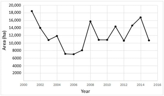 Using Landsat-7/Enhanced Thematic Mapper (ETM) + imagery, we have mapped the spread of irrigated cropland in the upper Ili River basin from 2000 to 2015 (Figure 4). Annual rates of expansion during this period varied between 7000 and more than 18,000 ha (Figure 5). This growth added 181,507 ha to the 1.06 million ha of irrigated cropland that we calculate existed at the turn of the century and corresponds to a 17.1% increase over 15 years. Our remote imagery-based calculation for 2015, 1.24 million ha, corresponds well to statistical estimates of irrigated land area [12] and provides important new spatio-temporal information. Most of the increase was concentrated in a widening band in the western part of the area, south of the Ili River and close to the border with Kazakhstan, but expanded irrigation is also evident further east along the Ili River and in areas near the Kash River. A wide variety of crops are currently grown in these irrigation areas: sunflowers, sugar beets, soybean, wheat, rapeseed, maize, cotton and vegetables [12,108]. As of 2000–2001, more than 21,000 ha were devoted to rice, cultivation of which was centered on both sides of the Ili River below Yining but also occurred upstream as far as the lower reaches of the Künes River [43]. Areas devoted to maize, cotton and rice all significantly increased between 2004 and 2010.