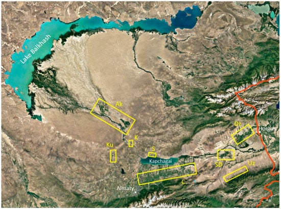 Locations of irrigation sites in the lower Ili basin of Kazakhstan: (Ak), Akdala; (C), Chilik River/Trans Ili Alatau; (Dz), Dzungarian Alatau; (K), Kurbulak; (Ku) Kurty River; (S), Shengeldy; (SD), Sharyn River delta; (Uz), Uzynkara. The orange line marks the border with China.
