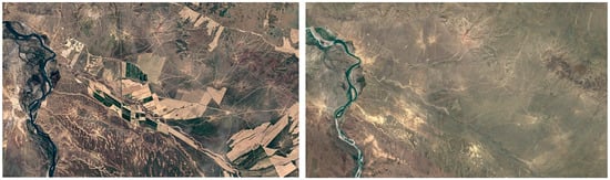 Construction of Kapchagai dam in the late 1960s made it possible to harness the Ili River and use its waters to irrigate areas that are more distant from the mountains, in arid zones lacking windblown loess soils [95]. These irrigation districts lie in or near the floodplain of the river’s lower reaches (Figure 6) and consist of sierozems mixed with poorer soils and other undesirable features such as sand dunes. Although irrigation of the largest district at Akdala relies on gravity, the other two districts (Table 3) represent attempts to irrigate with water pumped from the reservoir (at Shengeldy) or the river (at Kerbulak). Neither of the latter two sites was very efficient in terms of water use and neither survived the collapse of the Soviet Union, which placed a price on energy [75]. About 2400 ha at Kerbulak were refurbished and equipped with center pivot irrigation in the early 2000s, but there is no evidence that these areas are in operation today (Figure 7). The picture is brighter at Shengeldy, where the World Bank [117] updated the original irrigation system by reactivating pumps, replacing pipes and flumes and rehabilitating almost 2400 ha of land. In 2010, drip irrigation also was installed on 233 ha at Shengeldy [118]. This water saving technology permitted production of onions and other vegetables. The drip irrigation area had increased to 900 ha by 2017, allowing cultivation of sugar beet, grains and even a few apple trees. Shengeldy nevertheless remains dependent on energy costs and is much reduced in comparison to its original size.